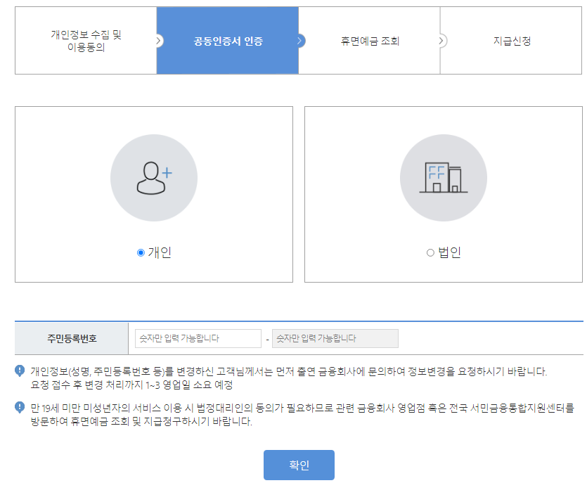 개인정보 동의 > 공동인증서 인증 > 휴면예금 조회 > 지급신청 의 절차로 진행됩니다.