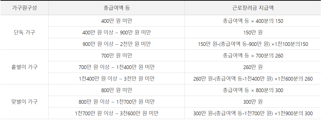 총 급여액에 따라 근로장려금 금액이 달라집니다. 단독가구인 경우 총 소득액이 400~900만원 사이면 최대금액인 150만원을 받을 수 있고, 400만원 미만이거나 900만원 이상이면 금액은 점점 낮아집니다.